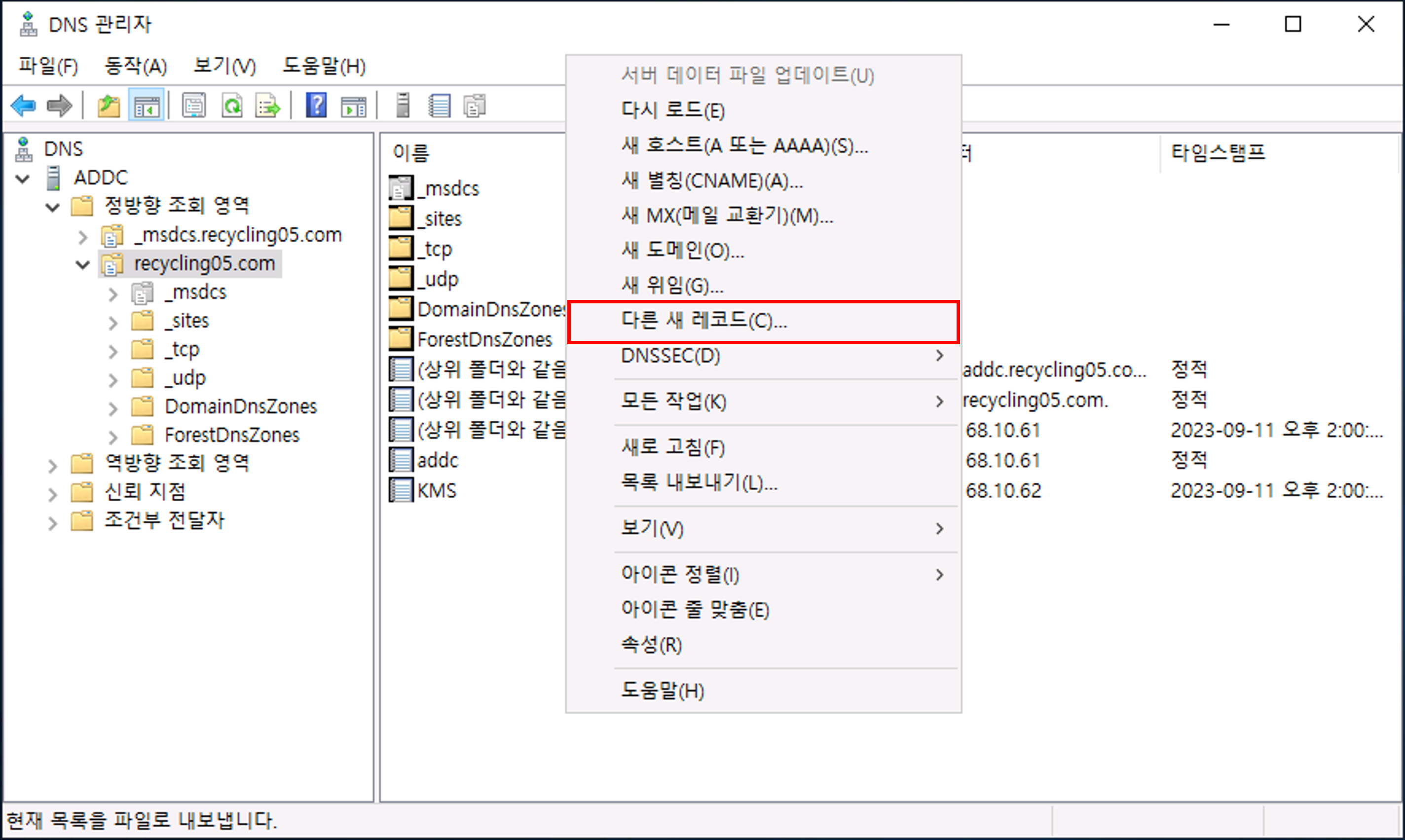 3. 콘솔 트리에서 전방 조회 영역을 확장하고 도메인을 마우스 오른쪽 단추로 클릭한 다음, 다른 새 레코드를 선택합니다.