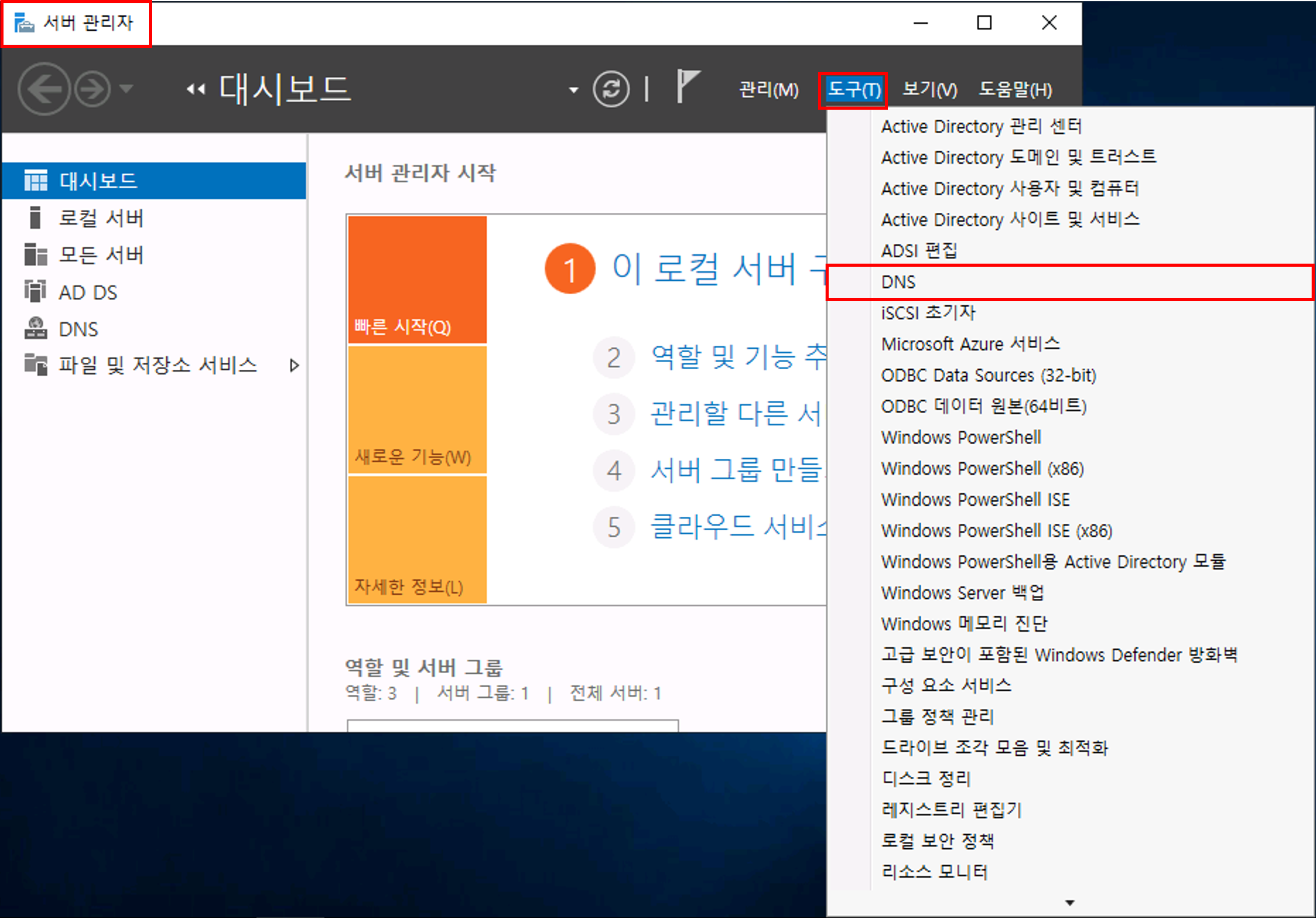 1. DNS 서버에서 DNS 관리자를 엽니다. DNS 관리자를 열려면 시작, 관리 도구, DNS를 차례로 선택합니다.