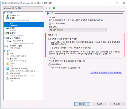 ※ [보안]에서 TPM을 사용 할 수 있도록 [신뢰할 수 있는 플렛폼 모듈 사용]에 체크를 합니다.