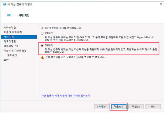 ※가상 컴퓨터 "2세대"를 선택하고 [다음]을 선택합니다.