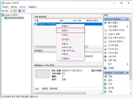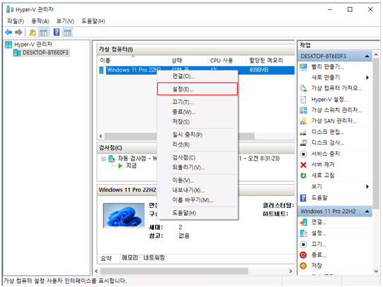 [Hyper-V 관리자]에서 "Windows 11" VM의 [설정]을 선택합니다.