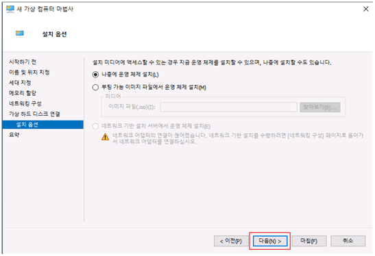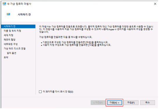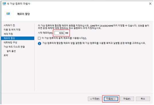 ※ 시작 메모리를 4GB(4096MB)이상 설정 후 [다음]을 선택합니다.