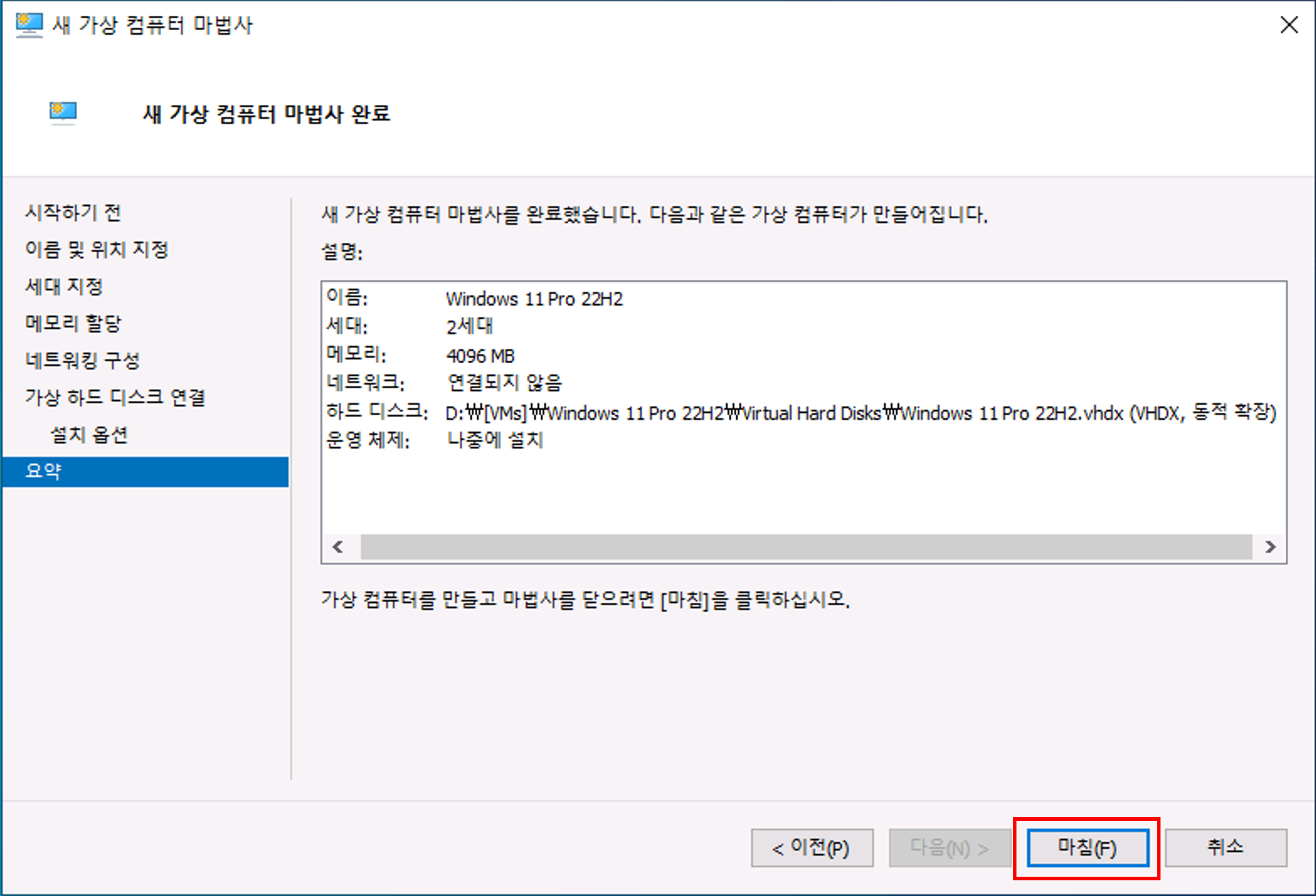 [마침]을 선택하여 가상컴퓨터 생성을 마칩니다.