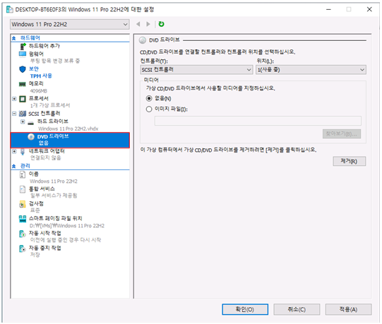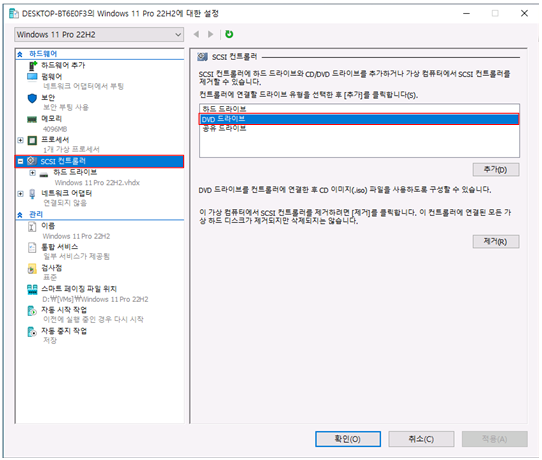 [SCSI 컨트롤러]에서 [DVD 드라이브]를 추가합니다.