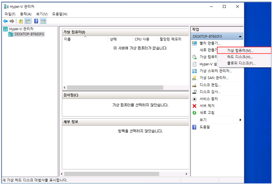 [Hyper-V 관리자]에서 [가상 컴퓨터]를 생성합니다.