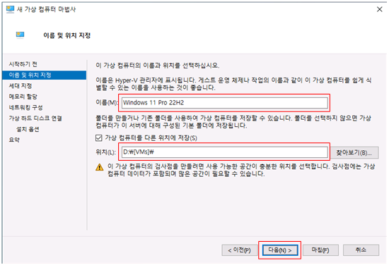 가상 컴퓨터 이름과 위치를 지정하고 [다음]을 선택합니다.