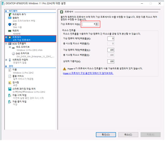 ※ [프로세서]에서 가상 프로세서 수를 2개이상 설정합니다.
