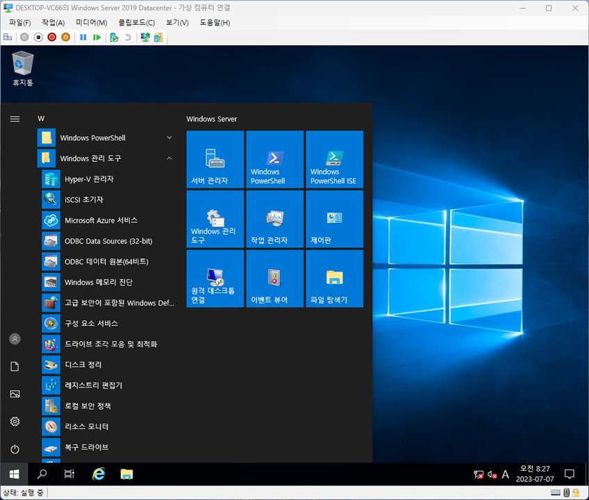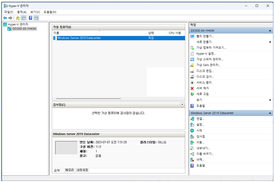 가상머신 Windows Server 2019 Datacenter에서 Hyper-V 활성화를 하여 중첩된 가상화를 활성화합니다.