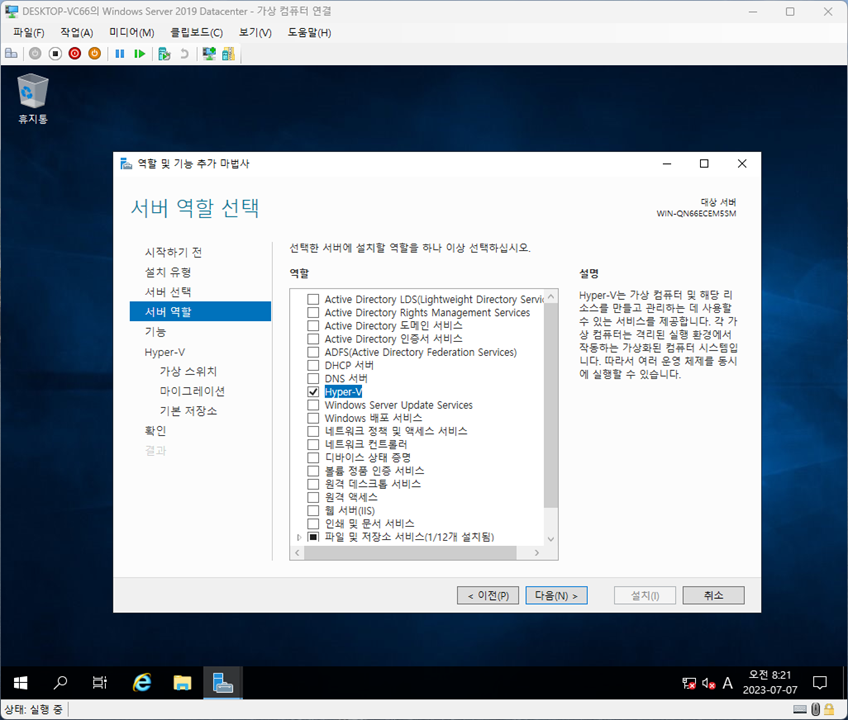 [역할 및 기능 추가]의 [서버 역할] "Hyper-V" 역할을 추가합니다.