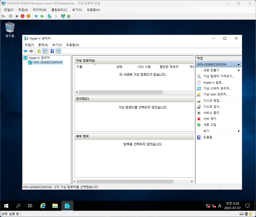 Hyper-V 관리자를 실행하여 가상머신을 생성합니다.