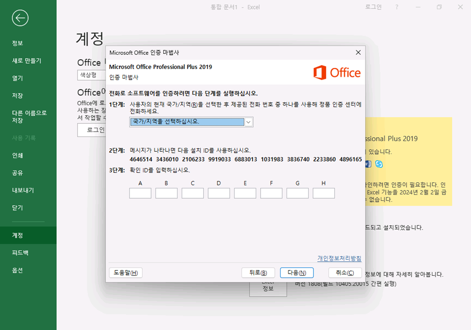 5. 제공된 설치ID를 통하여 받은 확인ID를 입력하여 정품 인증을 진행합니다.