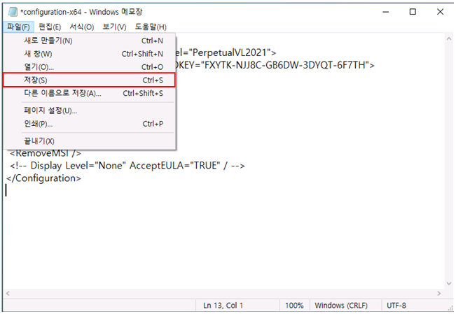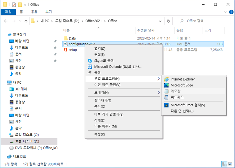 Office2021 > Office 폴더에 있는 configuration-64.xml 파일을 메모장을 열어 아래와 같이 편집 후 저장
