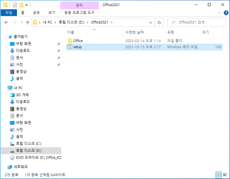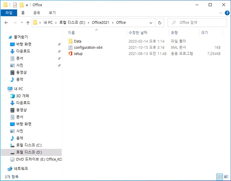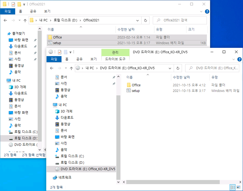 Office2021 폴더를 생성 후 Office2021 설치 DVD에 있는 내용을 모두 복사 진행