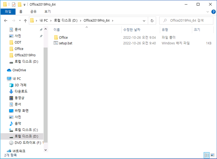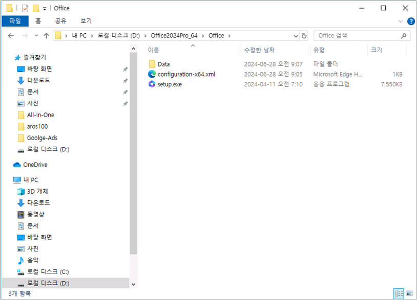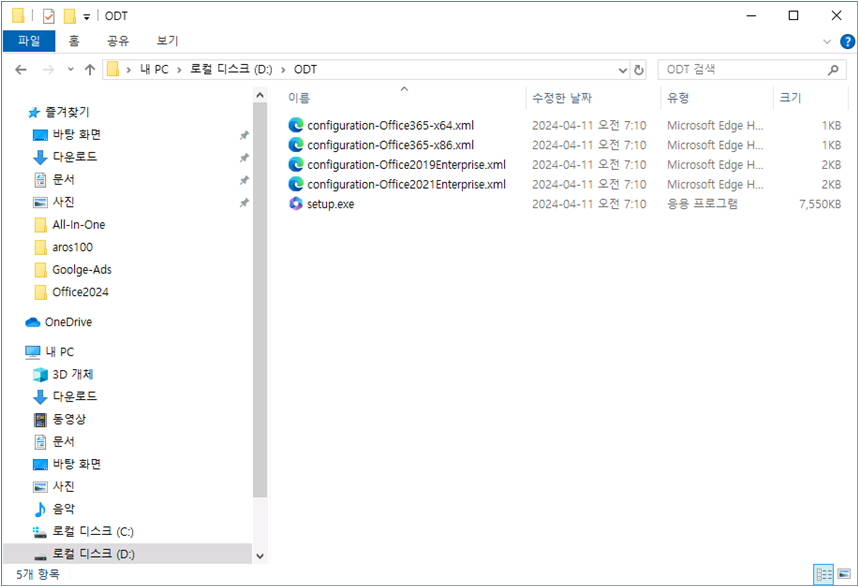 setup.exe, configuration-x64.xml 파일이 위치한 폴더로 이동합니다.