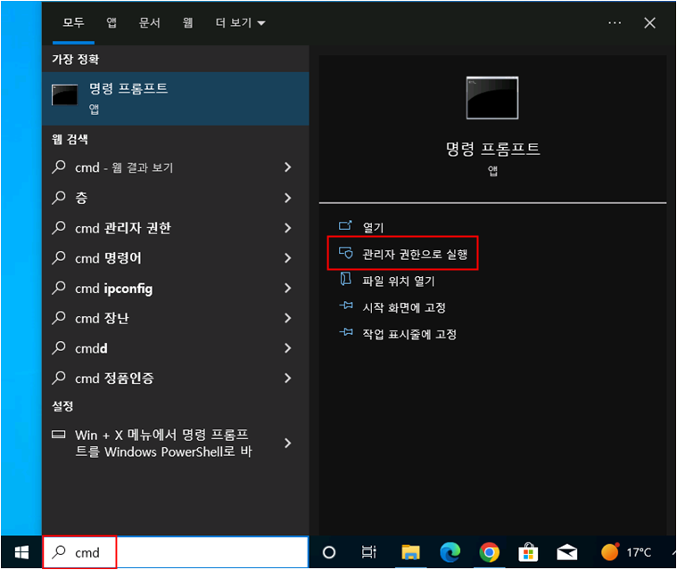 [명령 프롬프트]를 [관리자 권한으로 실행]합니다.