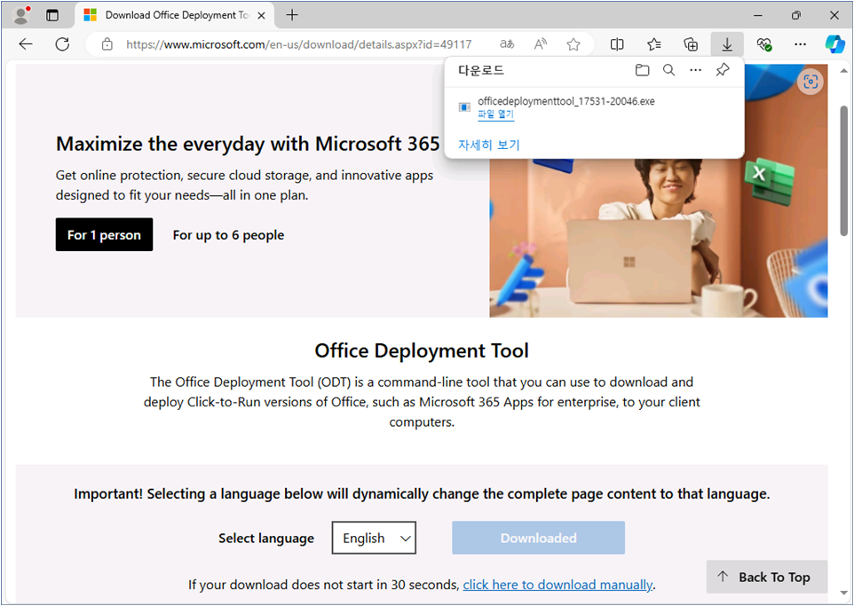 Office Deployment Tool 다운로드 페이지에서 파일을 다운로드합니다.