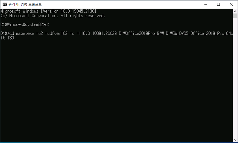 cdimage.exe -u2 -udfver102 -o -l16.0.10391.20029 D:\Office2019Pro_64\ D:\SW_DVD5_Office_2019_Pro_64bit.ISO