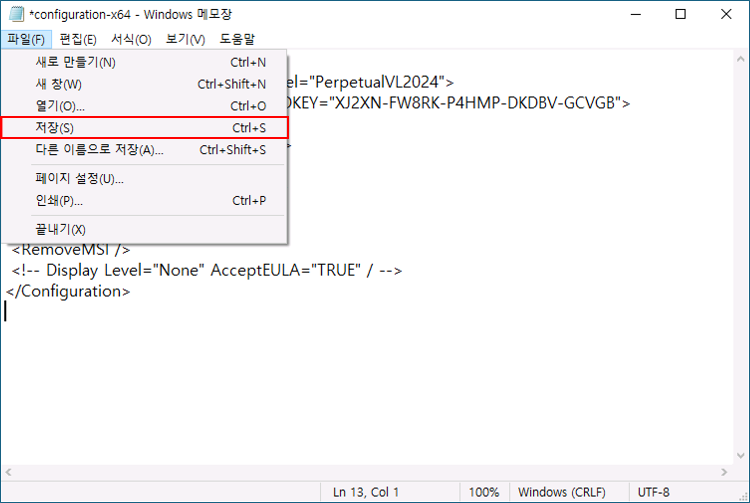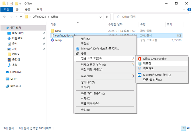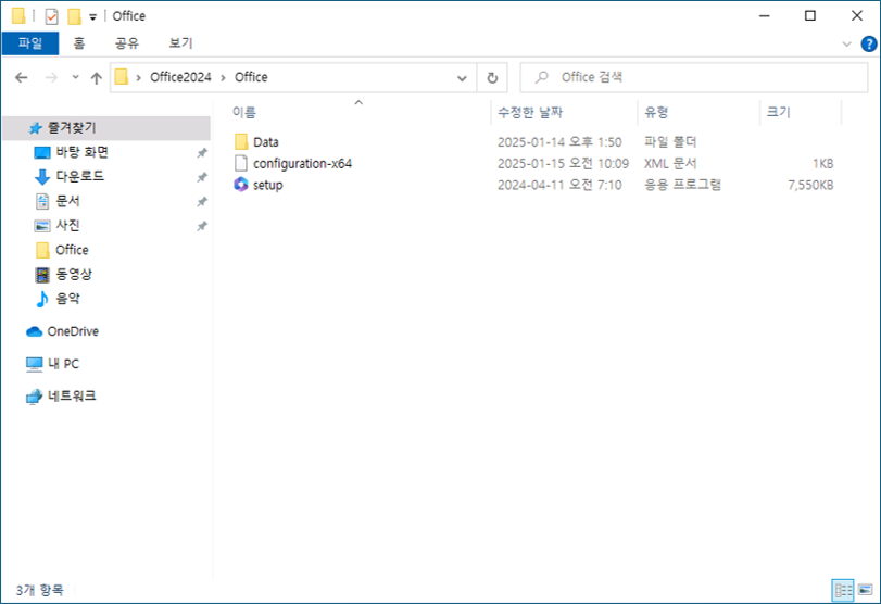 Office2024 > Office 폴더에 있는 configuration-64.xml 파일을 메모장을 열어 아래와 같이 편집 후 저장