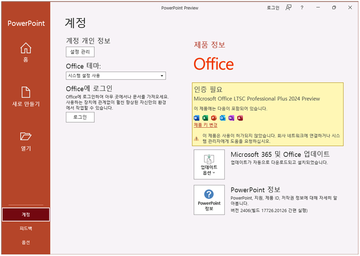 Microsoft Office LTSC Professional Plus 2024 Preview가 설치된 화면을 확인 할 수 있습니다.