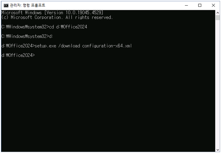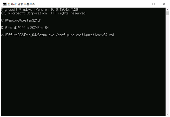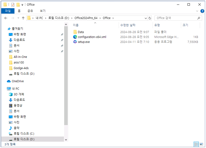 setup.exe, configuration-x64.xml 파일이 위치한 폴더로 이동합니다.