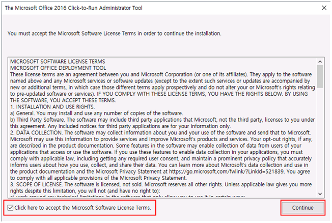 라이선스 동의에 체크 후 [Continue]를 선택합니다.