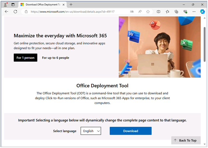 Office Deployment Tool 다운로드 페이지에서 파일을 다운로드합니다.