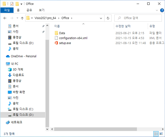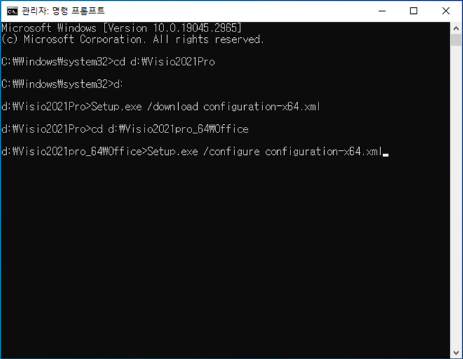 setup.exe, configuration-x64.xml 파일이 위치한 폴더로 이동합니다.
