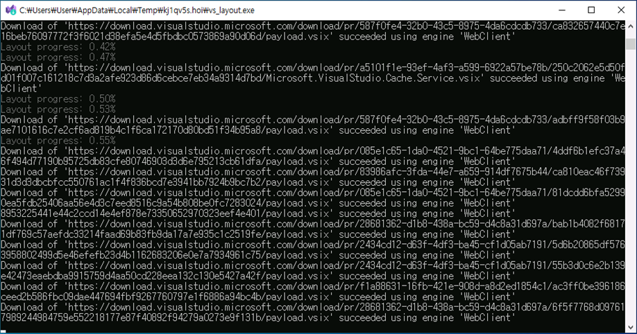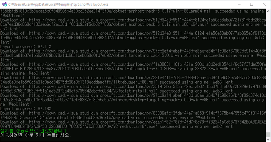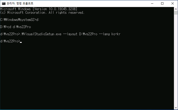 경로 이동 후 .\VisualStudioSetup.exe --layout D:\vs22Pro --lang ko-kr 명령어를 입력합니다.