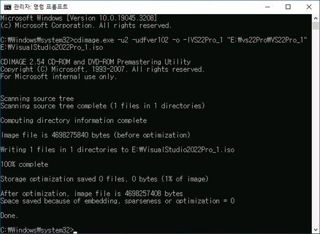 아래 명령어로 VisualStudio2022Pro_1.iso ~ VisualStudio2022Pro_11.iso 파일을 제작합니다.