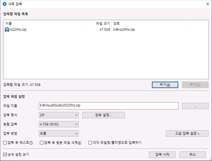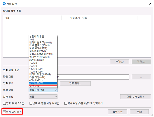 [상세 설정 보기]를 선택 후 [분할 압축]에 "4.7GB(DVD)"선택 합니다.