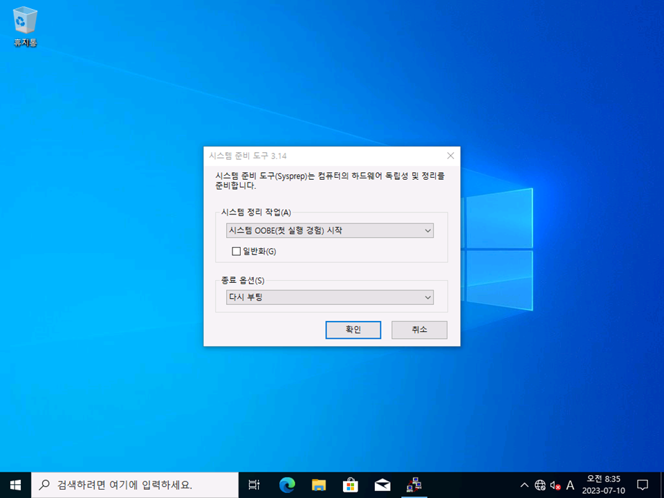 (재부팅 시에 Sysprep 화면이 계속 나오므로 [취소]를 선택하고 진행합니다.)