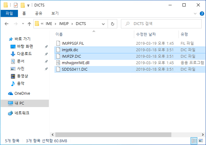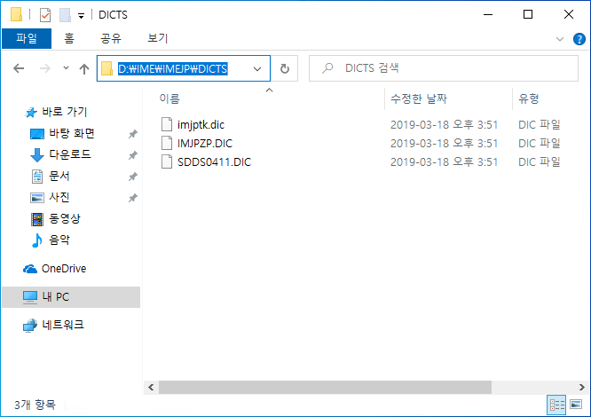 설치 미디어 D:\IME\IMEJP\DICTS 폴더에 있는 3개의 파일을 복사