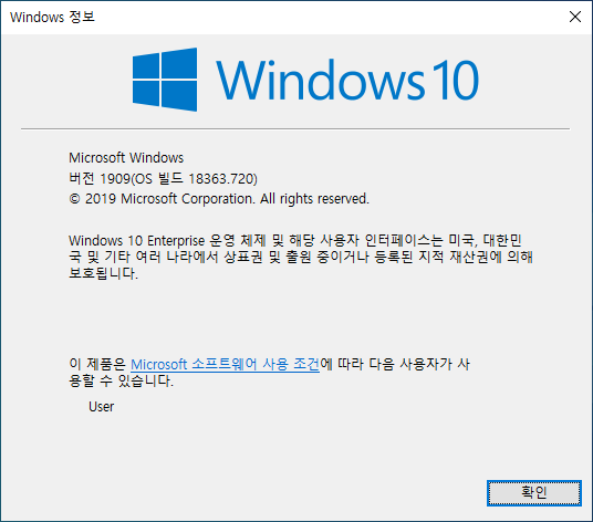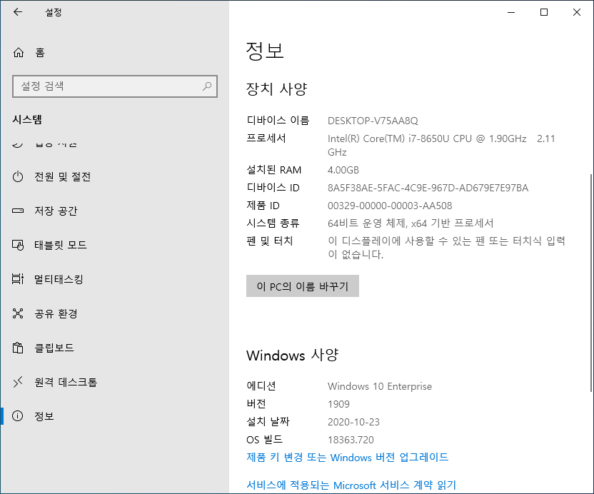 Windows 10 Enterprise 1909 Ver. 64bit OS 확인