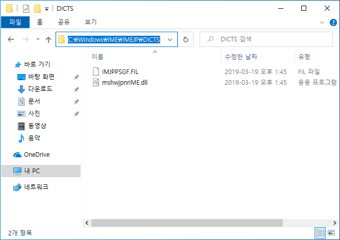일본어 언어팩이 설치 된 Windows 10 Enterprise 1909 Ver.의 C:\Windows \IME\IMEJP\DICTS 폴더에 복사한 파일을 붙여 넣음