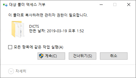 "계속(C)"를 선택하여 붙여 넣기 진행