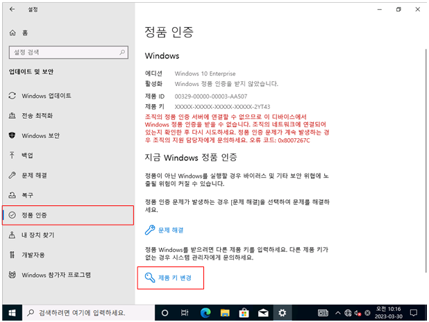 좌측에 [정품 인증] 탭을 클릭 후 우측에 [제품 키 변경] 클릭