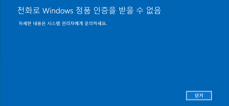 "전화로 Windows 정품 인증을 받을 수 없음" [닫기] 클릭 합니다.