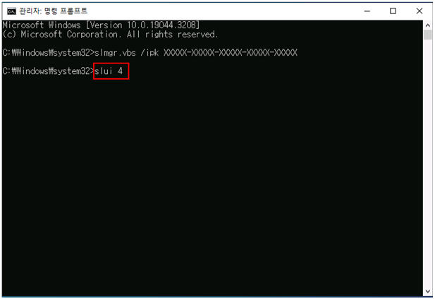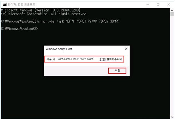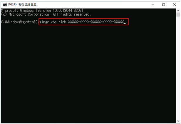 아래 명령어를 입력하여 제품 키를 설치합니다.