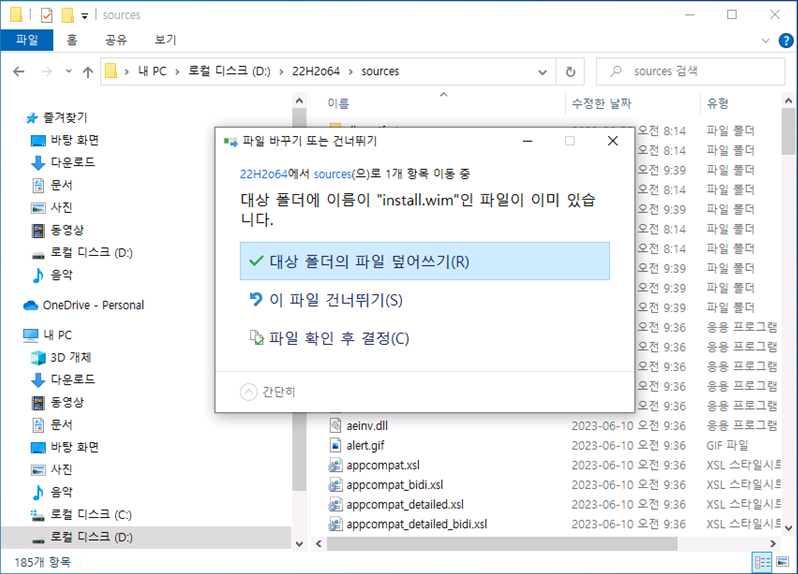압축 변환 된 install.esd 파일로 install.wim 파일을 대체 합니다.