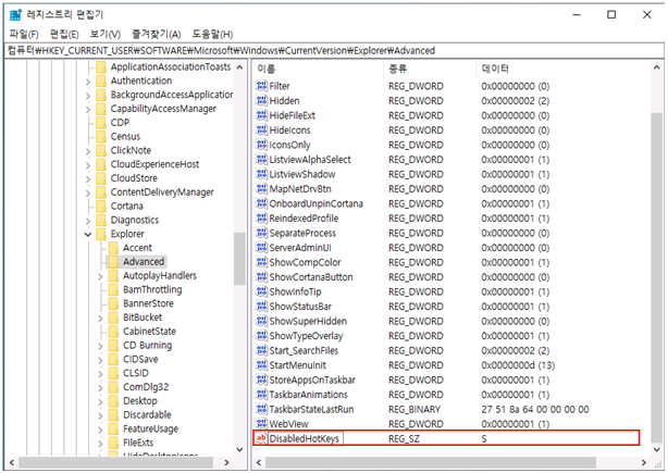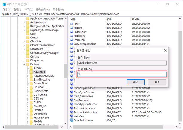 해당 경로에서 "DisableHotKeys" 값을 "문자열 값(S)"로 생성 후 "값 데이터(V)"에 "S"를 입력 후 [확인]을 클릭하여 설정합니다.