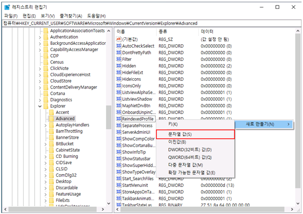 "컴퓨터\HKEY_CURRENT_User\SOFTWARE\Microsoft\Windows\CurrentVersion\Explorer\Advanced"으로 경로를 이동합니다.