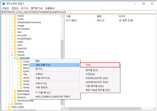 "컴퓨터\HKEY_CURRENT_MACHINE\SOFTWARE\Policies\Microsoft"으로 경로를 이동합니다.