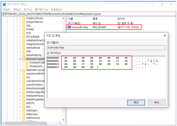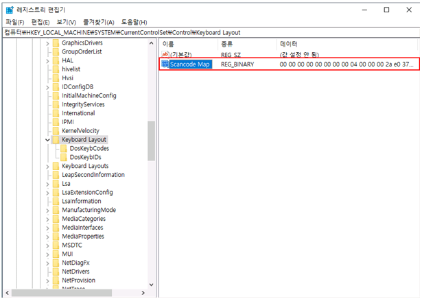 해당 경로에서 "Scancode Map" 값을 "이진 값(B)"로 생성 후 "값 이름(N)"를