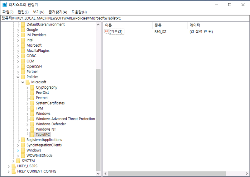 "Microsoft"에서 "새로 만들기(N)" > "키(K)" 선택하여 "TabletPC"을 생성 합니다.