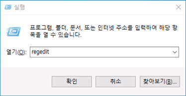 [실행] 창을 열어 "regedit" 입력 후, 엔터 또는 확인 클릭하여 [레지스트리 편집기] 실행합니다.