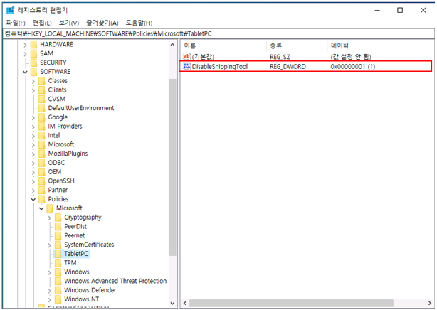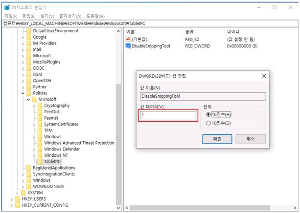 생성된 값을 "DisableSnippingTool" 변경 후 "값 데이터(V)"를 "1"로 바꾼 후 [확인]을 클릭하여 설정합니다.