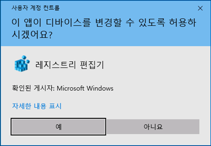 레지스트리값 설정 후에는 PC 재부팅 진행을 필히 합니다.