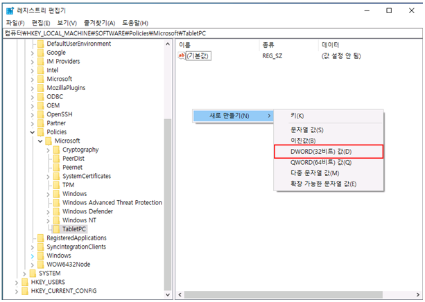 "TabletPC"에서 "새로 만들기(N)" > DWORD(32비트) 값(D) 생성합니다.