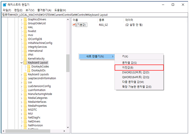 "컴퓨터\HKEY_CURRENT_MACHINE\SYSTEM\CurrentControlSet\Control\Keyboard Layout"으로 경로를 이동합니다.