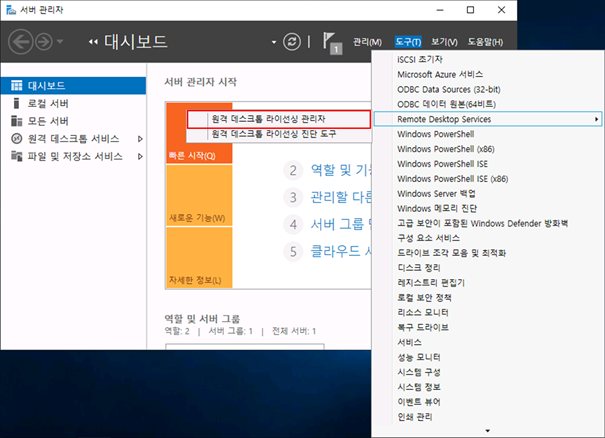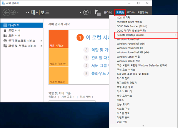 1. [서버 관리자]에서 [도구] 선택 [Remote Desktop Services] 선택